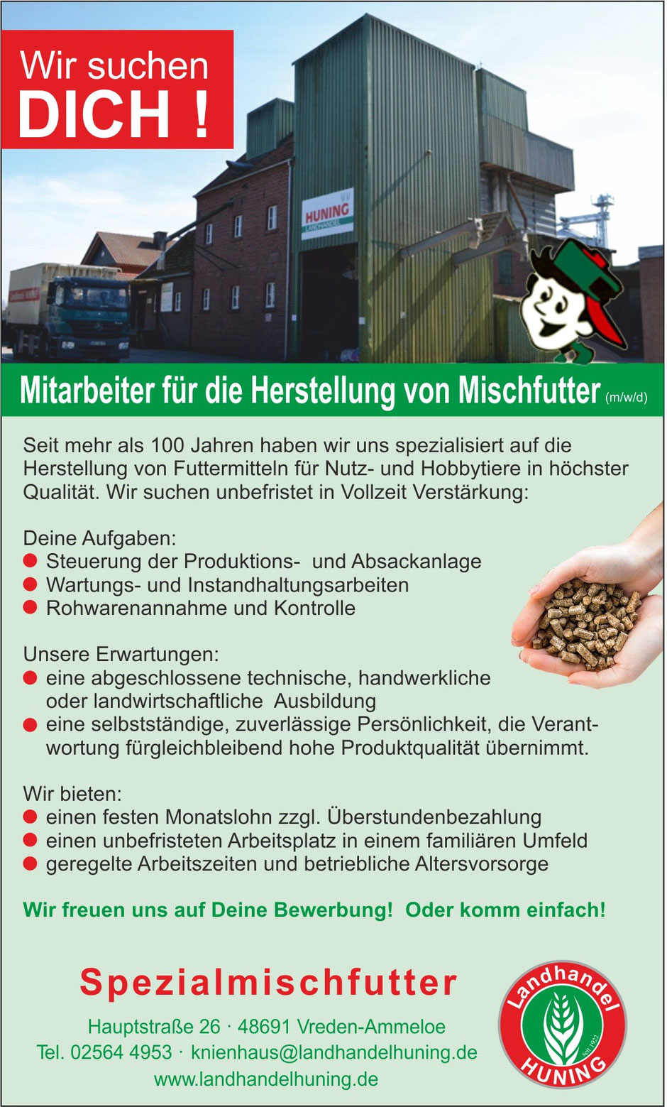 Seit 1922 steht der Name Huning für Qualität, Fachwissen und zuverlässigen Service rund um hochwertige Futtermittel für Hobbytiere und Landwirtschaft. Als regional verwurzeltes Familienunternehmen wissen wir, worauf es in der Tierernährung ankommt: gesunde, ausgewogene Mischungen, die auf die Bedürfnisse Ihrer Tiere abgestimmt sind – vom Hobbyhalter bis zum landwirtschaftlichen Betrieb.